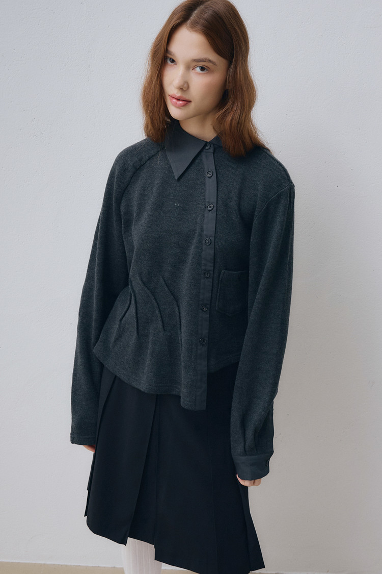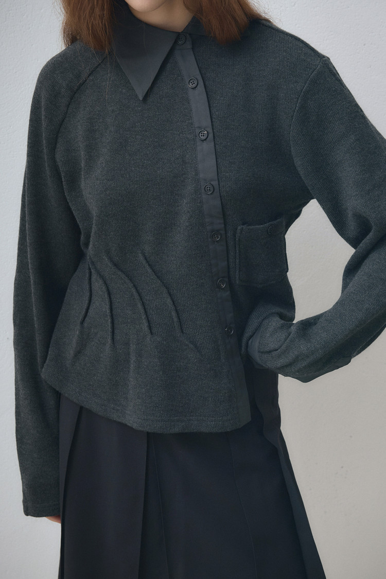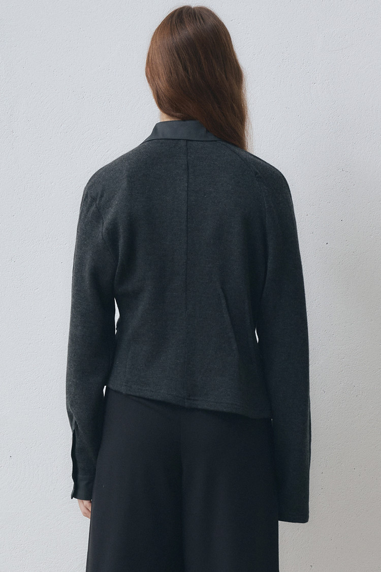 100% 울 니트와 100% 면 트윌 소재를 조화롭게 사용해 편안하면서도 구조적인 실루엣을 담아냈으며, 버튼은 자개 단추를 사용해 자연의 따뜻한 질감을 더했습니다.